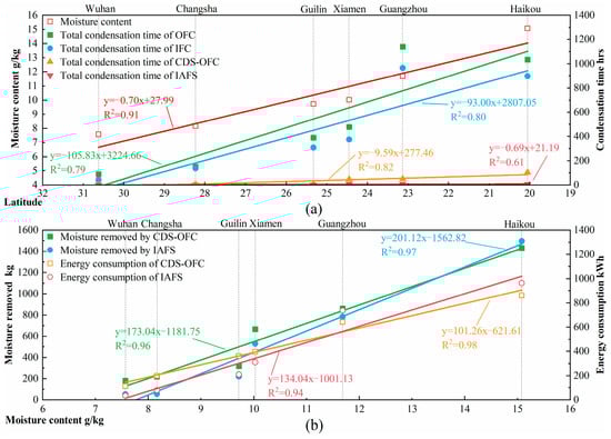 In South China, the moisture content gradually increases with the decrease in latitude and being closer to the sea, and the condensation risk in this region increases (Figure 4b and Figure 13a). It is discovered that both the CDS and IAFS can prevent condensation effectively, but the IAFS performs better in most southern cities, such as Wuhan, Changsha, Guilin, etc. The weather is quite cold in the winter, and the average room temperature stays at around 14.5 °C during the transient season, while the air moisture content increases as the outdoor air temperature goes up quickly. Therefore, the IAFS can effectively maintain a comfortable environment with less energy consumption. However, in a city with high moisture content and warm weather, like Haikou, the IAFS can still keep the floor dry but at a slightly higher energy cost. According to Figure 13, the IAFS is suitable for the cities where average air moisture is less than 12 g/kg in South China.