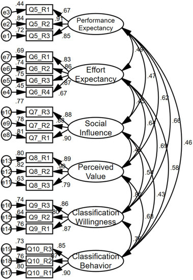 As shown in Table 7, performance expectancy, effort expectancy, social influence, perceived value, classification willingness and classification behavior were significantly correlated with each other (p < 0.001), and the standardized correlation coefficients between each latent variable and other latent variables were less than the square root of AVE, indicating that there was a certain degree of differentiation between each variable, that is, the discriminative validity of scale data was ideal.