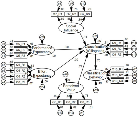 From Table 13, it can be seen that performance expectancy, effort expectancy, social influence, and perceived value have the highest to the lowest degree of influence on the total classification willingness, from perceived value (0.590) > effort expectancy (0.489) > performance expectancy (0.356) > social influence (0.319). Perceived value has the highest degree of influence, followed by effort expectancy, then performance expectancy, and finally, social influence. Therefore, we can promote the residual value of express packaging waste, reduce the difficulty of participation in sorting and recycling or give certain incentives to increase consumers’ willingness to participate in the sorting and recycling of express packaging. This will encourage consumers to actively participate in express packaging waste recycling.