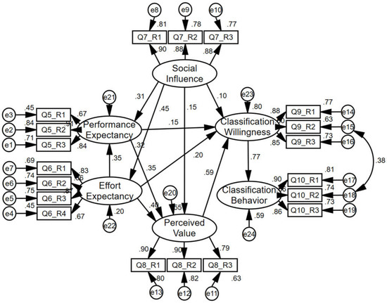 Based on the results of the above reliability and validity tests, in order to analyze the relationship and the path between factors influencing consumers’ willingness to participate in the sorting and recycling of express packaging, this study uses AMOS to construct a structural equation model, and the initial model is shown in Figure 3.
