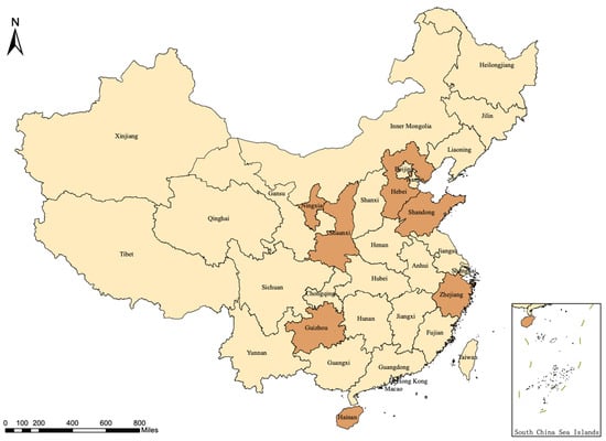 This research employs the panel data of 31 provinces (municipalities and autonomous regions included) as samples. Due to the unfeasibility of the data, Hong Kong, Macao, and Taiwan have been excluded. By 2019, eight provinces had been approved as all-for-one tourism demonstration zones, including Hainan (in January 2016), Ningxia (in September 2016), Shaanxi (in August 2017), Guizhou (in August 2017), Shandong (in August 2017), Hebei (in August 2017), Zhejiang (in August 2017), and Shanxi (in November 2019). In addition, since the tourism industry in China was seriously affected by COVID-19 in 2020, the research period is set from 2010 to 2019, avoiding the negative impact of exogenous issues. By considering the establishing time of demonstration zones and the research period, this research assigns Hainan, Ningxia, Shaanxi, Guizhou, Shandong, Hebei, and Zhejiang into the treatment group. The remaining 24 provinces are in the control group. Figure 1 presents the geographical distribution of sample regions by the end of 2018.