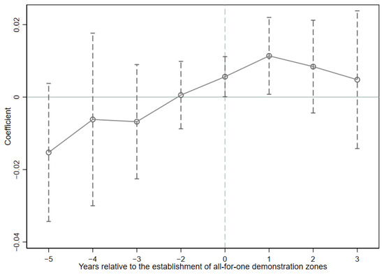 That research samples satisfy the parallel trends is an essential prerequisite for DID model, which means that the development quality of the tourism industry in the treatment and control group have the same trend before the establishment of all-for-one tourism demonstration zones. Five-time points (−5, −4, −3, −2, and −1) before the establishment, three-time points after the establishment (1, 2, and 3), and the establishing time (0) are set. In particular, time = −1 is selected as a baseline to alleviate collinearity issues (Chi and Han, 2023) [47]. As is shown in Figure 3, coefficients are not significantly different from 0 before the establishment of demonstration zones, indicating no significant difference between the treatment and control group samples before the establishment of all-for-one demonstration zones. This means that the evolutionary time trend is consistent with the parallel trend.