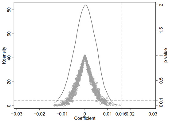 The placebo test randomly assigns the establishing time of all-for-one tourism demonstration zones and examines whether any omitted variables influence the result. Figure 4 reports the distribution of coefficients and p-value from 500 runs. Compared with the coefficient of baseline estimation of 0.016 in column (8) of Table 4, most coefficients in the placebo test are distributed far from 0.016 and not statistically significant (p > 0.1), indicating the insignificant effect of the random assignment of establishing time of all-for-one tourism demonstration zones on high-quality development of tourism industry. The aforementioned results are reliable.