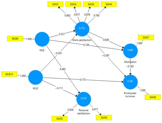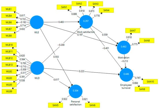 In order to optimize the model that emphasizes the influences of WLB on professional and personal satisfaction, as well as on the motivation and employees’ turnover intention, we eliminated exogenous variables that had a load of less than 0.7, proceeding according to the methodology described by Hair, Hult, Ringle, and Sarstedt [73].