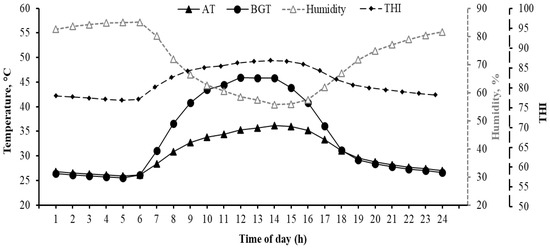 Hourly patterns of climate measures during the study period: air temperature (AT), relative humidity (%), temperature humidity index (THI), and black globe temperature (BGT).