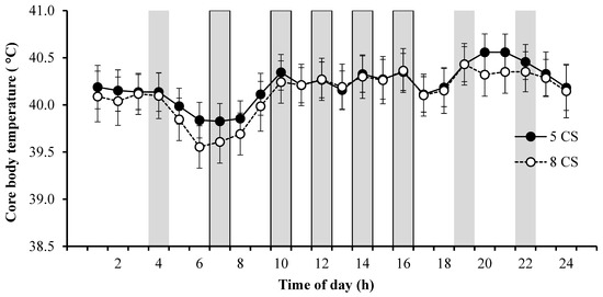 Mean hourly core body temperature of lactating Holstein cows cooled with 5 cooling sessions (5CS: solid line with solid circle) or 8 cooling sessions (8SC: dashed line with open circle) during August and September 2021 (n = 8 animals per treatment, 24 d of recording/animal, 24 h/day). The shaded bars indicate the timing of each 60-min cooling session, which consisted of 10 sprinkler cycles per hour each with 3 min of water on and 3 min off. The bars with solid border indicate the common cooling sessions between the 5CS and 8CS treatment groups. The statistical analysis was performed for each time point, and instead of presenting individual p-values, the SE was reported to represent the variability within each group. The crossing of the error bars indicates a non-significant difference between the groups.