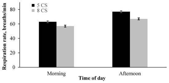 Mean respiratory rate (breaths/min) of Holstein cows cooled with 5 cooling sessions (5CS: black bar) or 8 cooling sessions (8CS: gray bar) at two time points during August and September 2021 (n = 8 animals per treatment, 24 days of recording per animal, 3 recording days per week). Error bars indicate the standard error of the mean (SEM; Pooled SEM = 1.33). The interaction between cooling sessions and time of day was significant (p = 0.005).