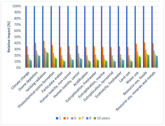 Relative impact results of one wear of the analyzed undershirt for varying numbers of years before disposal (from 1 to 10 years).