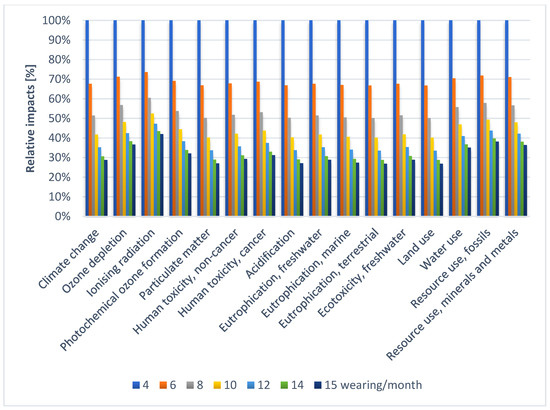 Relative impact results of wearing the analyzed undershirt at varying frequencies (from 4 to 15 wearing/month).