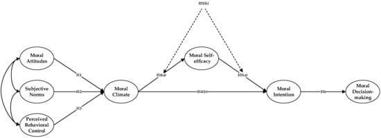 Taking inspiration from the existing literature, this study builds upon the TPB framework by introducing additional variables, namely moral climate and moral self-efficacy. These variables are integrated alongside the original TPB constructs, including attitudes, subjective norms, perceived behavioral control, and behavioral intention, to provide a more holistic understanding of the topic. The framework is illustrated in Figure 1.