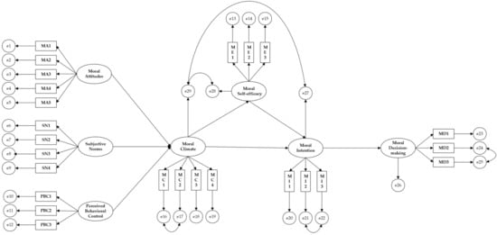 Qualitative methods included focus groups and expert consultations to adapt items from other settings and create new ones. The questionnaire items used in this study mainly refer to the moral identity questionnaire (MIQ) developed by Black and Reynolds [46], the subjective norms section of the subjective norms and perceived behavioral control scale (SNPBC) developed by Cordano and Frieze [47], the entrepreneurial intention questionnaire (EIQ) developed by Liñán [48], the general self-efficacy scale (GSE) developed by Schwarzer and Jerusalem [49], the ethical climate questionnaire (ECQ) developed by Cullen et al. [50], the scale developed by Hofmann et al. [51], and the managerial ethical profile (MEP) scale developed by Casali [52].