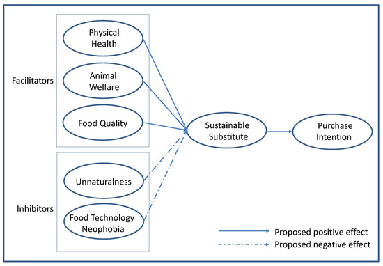 Drawing upon dual-factor theory, this study tests a conceptual model depicting the relationship between two opposite influencing factors related to perceptions toward and the consumption of cultivated meats. As shown in Figure 1, the influencing factors are approached from two perspectives (facilitators and inhibitors). Facilitators include physical health, animal welfare, and food quality, while inhibitors include unnaturalness and food technology neophobia. These factors are expected to influence cultivated meats’ sustainable substitutability for conventional meats and, ultimately, consumers’ purchase intention.