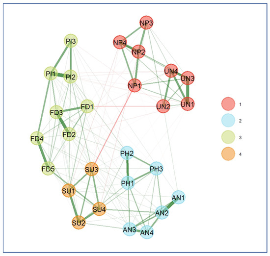 Next, we ran an Exploratory Graph Analysis (EGA), a graphic form of nomological validity that represents the degree to which a construct behaves as it should within a system of related constructs [66]. EGA is a new technique that estimates the number of factors underlying multivariate data with a visual guide–network plot. The plot not only indicates the number of dimensions to use but also how items cluster and their level of association in each cluster [67]. In EGA, nodes represent variables, and edges represent the correlations between two nodes. Because EGA is an exploratory method that does not rely on a priori conceptual assumptions, its outcome further validates the dimensionality of factors in the measurement model [67].