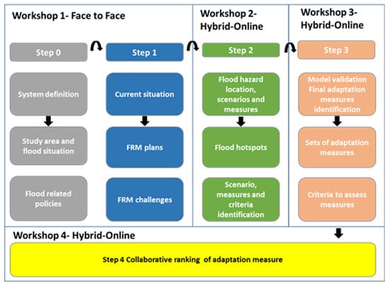 The study adapted and tested the Collaborative Modeling framework proposed by Evers et al. (2012) [12] in the transboundary LMR FRM context, taking into account the specific case settings and the impact of the COVID-19 pandemic, which limited face-to-face interactions. The modified Collaborative Modeling framework was implemented through four workshops (Figure 2) and involved five key steps. These steps included: Step 0—Defining the system: This aimed to gain a better understanding of the flooding situation and existing policies. Step 1—Current situation analysis: The focus was on comprehending the challenges faced by the current FRM practices. Step 2—Identification of flood hotspots and scenarios: This involved pinpointing the most exposed areas prone to flooding and exploring various scenarios. Step 3—Stakeholder validation: The model results were validated by the stakeholders to facilitate the identification of adaptation measures and criteria for evaluating their effectiveness. Step 4—Collaborative adaptation measure ranking: This step entailed conducting an exercise to rank the adaptation measures collaboratively, supporting consensus-based decision-making regarding preferences for implementation. All workshops were conducted in the official French language, which is spoken in both Togo and Benin.
