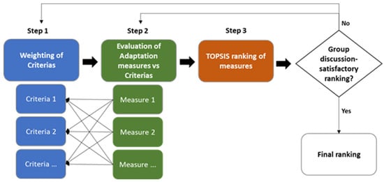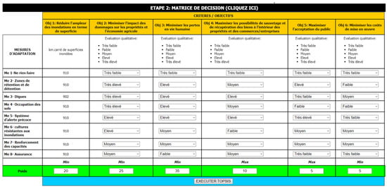 The measures identified in Step 2 (part 3) were synthesized by removing redundant measures and by combining complementary measures. Thus, a final set of eight measures was obtained. In addition, a final list of six criteria was derived based on their relevance and the prioritization work previously conducted by the stakeholders. The final sets of adaptation measures and criteria are presented in Table 2.