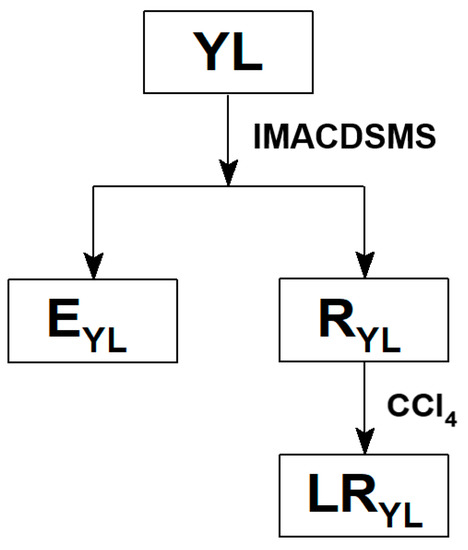 As shown in Figure 1, YL (10 g) was added to a conical flask with 200 mL of isometric acetone/carbon disulfide mixed solvent (IMACDSMS) in it. The conical flask was placed in an ultrasonic instrument at room temperature for 1.5 h. Then, the mixture in the flask was filtered to obtain the liquid (EYL) and residue (RYL). RYL was further treated with 200 mL of carbon tetrachloride under the condition of ultrasonication for 1 h; then, the mixture was poured into a separatory funnel, standing for 0.5 h. Subsequently, layering appeared in the funnel and the bottom precipitate (heavy residue) was removed in this step. The upper mixture from the separatory funnel was filtered and the filter cake was dried at 105 °C for 12 h to obtain LRYL.