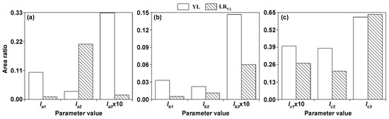 Ic1 is defined as the ratio of the relative content of asymmetric –CH2 to –CH3 groups in the aliphatic structure, representing the length of bridge bonds and aliphatic side chains. Ic2 is defined as the ratio of aromatic C–H to aromatic ring C=C, representing the abundance of the hydrogen element in the aromatic structure. The higher the value, the lower the number of substituents on the aromatic ring. Ic3 is defined as the ratio of the sum of two isolated aromatic hydrogens (1H and 2H) to the total aromatic hydrogens, representing the proportion of aromatic rings with high substitution in the overall aromatic rings. Ic1 reflects the distribution of the hydrogen element in the aliphatic structure, while Ic2 and Ic3 represent the degree of substitution in the aromatic rings from different perspectives. As illustrated in Figure 4c, Ic1 and Ic2 decreased by 32.15% and 44.73% for LRYL compared to YL, indicating that the distribution range of the hydrogen element in the aliphatic structure increased and the degree of substitution of the aromatic rings increased.
