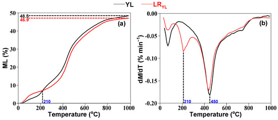 As illustrated in Figure 5a, the mass losses of YL and LRYL are 48.55% and 46.94%, respectively, with a slight decrease in the mass loss of LRYL compared to YL. As shown in Figure 5b, the difference in the maximum mass loss peak temperature between the two samples is not significant (around 450 °C), indicating that the macromolecular network structure of the coal was not damaged during the solvent treatment process.