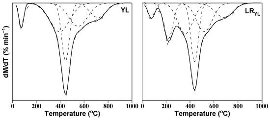 The mass loss rate of both samples reached its maximum at around 450 °C and the pyrolysis reaction of the two samples is violent at the temperature, with rapid mass loss—the release of large amounts of volatile compounds. And the temperature region around 450 °C is the main stage of the cracking reaction of the macromolecular structure in the two samples. Based on DTG data, pyrolysis characteristic parameters of the two samples can be obtained, as shown in Table 4. The comprehensive devolatilization index (D = [(dM/dT)max − (dM/dT)mean]/(Tmax − Ti − ΔT1/2)) was calculated for both samples with reference to the literature [12]. The results present that the value of D of LRYL is higher than that of YL, indicating better pyrolysis reactivity.