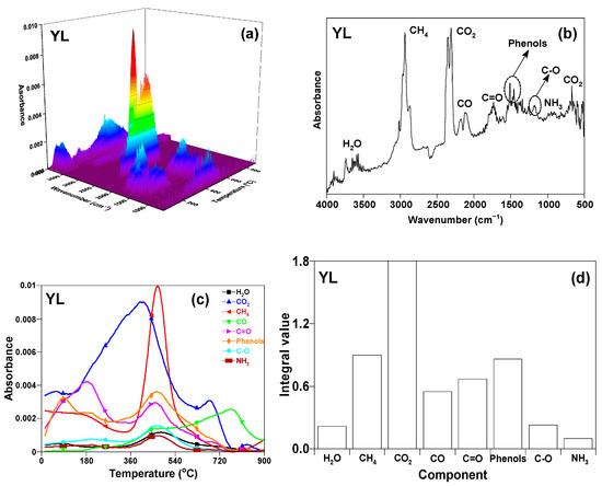 TG-FITR diagram of YL (a) 3D infrared spectrum; (b) TG-FTIR spectrum for volatiles at 450 °C; (c) absorbance of volatiles with the increasing of temperature; and (d) yield of emissions from the pyrolysis of YL.