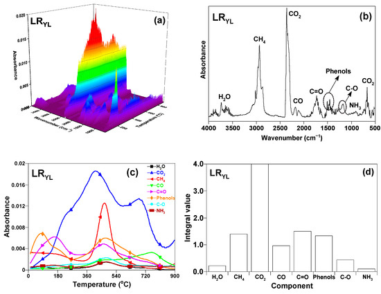 TG-FITR diagram of LRYL (a) 3D infrared spectrum; (b) TG-FTIR spectrum for volatiles at 450 °C; (c) absorbance of volatiles with the increasing of temperature; and (d) yield of emissions from the pyrolysis of LRYL.