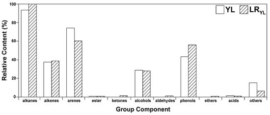 Flash pyrolysis products from YL and LRYL at 450 °C were analyzed by TG-FTIR-GC/MS test (Figures S1 and S2). The results showed that 55 organic compounds were detected in the pyrolysis products from YL, and 53 from LRYL (Tables S1–S5). All the compounds can be classified by their group composition into alkanes, alkenes, arenes, oxygen-containing compounds, and other heteroatoms-containing compounds. And the oxygen-containing organic compounds can be subdivided into alcohols, phenols, ketones, ethers, and carboxylic acids.