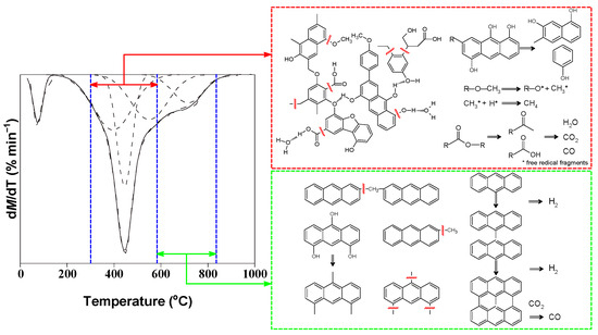 In order to investigate the pyrolysis process of the two samples in detail, the DTG profiles of the two samples were fitted by Peakfit software [20], and the results are displayed in Figure 6 and Table 5. As shown in Figure 6, before 300 °C, the bound water in the coal was released, and weak chemical bonds, with bond energy less than 150 kJ/mol, such as carboxyl groups, were decomposed. The temperature range of 300–420 °C was mainly attributed to the breakage of Cal–O, S–N, and S–S bonds, with bond energy in the range of 150–230 kJ/mol. The rapid pyrolysis region of coal (420–550 °C) was dominated by the release of large amounts of volatile organic compounds from the network of coal, including the breaking of bonds, such as Cal–Cal, Cal–H, Cal–O, and Car–N in the samples with bond energy in the range of 210–320 kJ/mol; simultaneously, the stabilization of macromolecular fragments might occur and coal tar might be formed. The stage in the range of 550–650 °C was mainly attributed to the breaking of Car–Cal, Car–O, S–N, and S–S bonds in the sample. As the rate of tar cracking exceeds the rate of tar formation, the alkyl aromatic form of tar was prone to cracking and small aromatic molecules containing C–C groups might be produced. After 700 °C, the temperature region was defined as the slow condensation stage, where the aromatic rings condensed to produce H2, and a small amount of CO was also produced, derived from the reaction of coke and CO2.