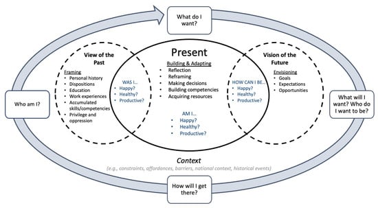To construct and maintain career sustainability, one must make sense of their self-concept, their context, and the meaning of their career. We argue that one engages in a perpetual process of examining these elements retrospectively and prospectively so one can take adaptive action in the present. Sensemaking happens in the present, but with a view to the past (i.e., framing) and a vision of the future (i.e., envisioning). In other words, careers are shaped by the past, as framed and understood in the present, with action taken in the present to adapt in the pursuit of envisioned goals for the future. The individual answers the question “Who am I?” by framing information from their past, such as their educational and work experiences, personal history, the skills they acquired and demonstrated in the past, and any privilege or oppression they perceive, into a personal narrative or “career story” [32]. This story allows the individual to assess career sustainability in the past by answering the following questions: Was I happy? Was I healthy? Was I productive? What does it mean to be happy, healthy, and productive?