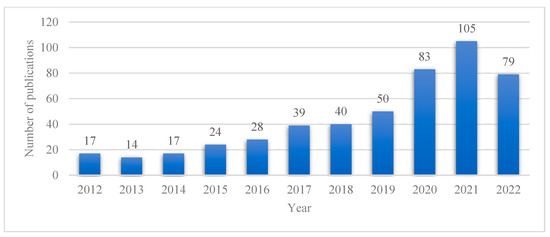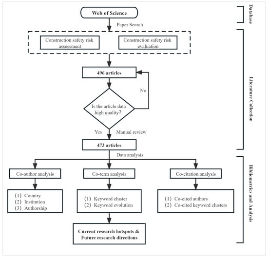 “Construction safety risk assessment” and “Construction safety risk evaluation” were some of the search terms used to find articles in the field of construction risk assessment. The type of literature was then set to “journal articles”, the language to “English”, and the field of expertise to “civil engineering” to ensure the high quality of the data source. In addition, the articles’ period was set to 2012–2022 to ensure the cutting-edge nature of the articles. Then, 496 papers were initially selected. However, bibliometric analyses heavily rely on accurate metadata, such as author names, publication titles, abstracts, year of publication, and citation information. If any of these key metadata are missing, incomplete, or incorrectly formatted in the WoS data export, the bibliometric software may have difficulty correctly processing the data. We manually screened and excluded 23 papers with incomplete data to ensure the validity of the analysis, so the final number of documents used for bibliometric analysis was 473.