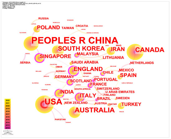 Co-country analysis can quantify spatial article distribution [62]. Figure 4 depicts a network of 64 nodes and 67 links containing the primary contributing countries in the field. The nodes in the network represent individual nations, the size of the nodes is proportional to the number of publications per nation, and the outer purple circle of the nodes reflects the strength of mediated centrality. China has the most articles, followed by the United States, Australia, Canada, and Korea. Mediation centrality indicates the significance of a network node. England has the most extraordinary centrality, followed by Portugal, Scotland, France, and Singapore. They are international cooperation leaders.