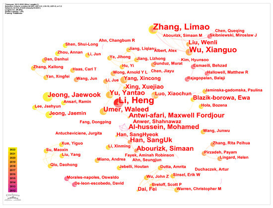 Co-author analysis aims to reveal the influential authors and their collaborative relationships with each other [63]. By monitoring their research interests, knowledge area research trends can be uncovered. The co-authorship network of the principal authors is depicted in Figure 5. This network’s threshold value is set to two consisting of 310 nodes and 245 links; the node size represents the frequency of each author’s publications, and the links between nodes illustrate the authors’ collaborative relationships. There are several complex research groups in the field of construction risk assessment, centered on those of Zhang Limao, Wu Xianguo, Li Heng, Jeong Jaewook, and others. Many groups are from China, such as those of Xue Yiguo, Liu Yang, Qiu Daohong, and Su Maoxin. There are groups from other nations, such as those of Han SangUk, Abourizk Simaan, and Han SangHyeok.
