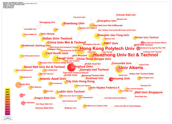 The network of co-occurring institutions is shown in Figure 8. The threshold value for this network is set to 2. It has 274 nodes and 199 links; the links between the nodes indicate collaboration between institutions. Most institutions are universities, such as the Huazhong University of Science and Technology, the Hong Kong Polytechnic University, the University of Alberta, Tongji University, and Tsinghua University, which are network cores, forming several large research communities. For example, the Huazhong University of Science and Technology, the Hong Kong Polytechnic University, the University of Alberta, the Polish Academy of Science, the Nanyang Technology University, and other institutions form one of the largest research chains. Smaller research collaborations exist, for example, between the Delft University of Technology, the Autonomous University of the State of Mexico, and the Netherlands Organisation for Applied Scientific Research TNO. In addition, there needs to be more external collaboration at about 20 institutions. In the future, cooperation between institutions must be bolstered to expand the channels for disseminating research experience.