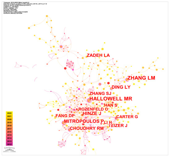 As shown in Figure 9, the author co-citation network in this study has 474 nodes and 865 links, designed to filter out crucial information about the authors and their relationships. Only a few of the network’s nodes are more important, which shows that research in the field is concentrated. The thick lines between nodes reveal close relationships between the most cited authors. Among them, the top five authors in terms of mediated centrality are Chan Apc, Hallowell, Fema, Choudhry Rm, and Pearl J; the top five authors in terms of frequency are Hallowell, Zhang Lm, Hinze J, Mitropoulos P, and Ding Ly.