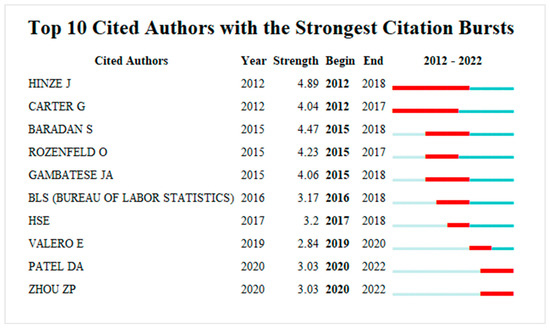 The top ten authors in terms of burst intensity are shown in Figure 10. Hinze J was the most frequently cited, followed by Baradan S, Rozenfeld O, Gambatese Ja, and Carter G. In addition, the authors with high burst intensity values were HSE, BLS, Patel Da, and Zhou ZP. The results show that these authors are essential in construction risk assessment. Considering the results of the author analysis in Table 5 and Figure 10, this study found that many authors, including Hallowell, Hinze J, Zhang Lm, Ding Ly, and Choudhry Rm, have been working on construction risk assessment for many years and have made significant contributions. Hinze J has a high co-citation frequency, centrality, and burst intensity frequency, indicating that many scholars recognized Hinze J’s research. Their research continues to have a profound impact as a cornerstone of the current developments in construction risk assessment. Following the research work of these authors helps to acquire knowledge and capture future trends in the field.