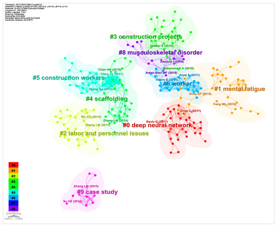 Using CiteSpace’s cluster analysis, quantitative analysis of co-cited references can reveal the primary trends in each field [121]. CiteSpace proposes two metrics, the mode value (Q-value) and the average profile value (S-value), based on the clarity of the network structure and clustering, as indicators of validity [122]. Generally, a Q-value of [0, 1] generates significant clustering graphs when the Q-value exceeds 0.3; clustering is efficient and convincing when the S value is 0.7. Clustering is usually considered reasonable if the Q-value exceeds 0.5 [123]. This study reveals the current hotspots and future trends in construction risk assessment. In this paper, co-cited references were, therefore, evaluated for clustering, and keywords were collected as clustering labels. Figure 11 depicts the cluster analysis graph as a co-citation reference network with 422 nodes and 854 links. The graphs of cluster analysis with Q = 0.8252 and S = 0.9246 reveal a significant and well-clustered clustering structure. The cluster analysis produced a total of nine primary clusters.