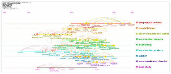 The size of the nodes in the timeline plots shows how many co-cited references each cluster has [42]. As shown in Figure 12, nine clusters have the highest frequency of co-citations, indicating that they are the most popular topics in the field. The average year that each cluster appears shows how the clusters change and grow over time. Before 2015, scholars researched labor and personnel issues, like how construction workers were treated. Most of these studies used traditional case study methods. From 2015 to 2020, scholars began to use construction projects. After 2020, most scholars explored how to assess construction risks more accurately and quickly by incorporating deep neural networks.