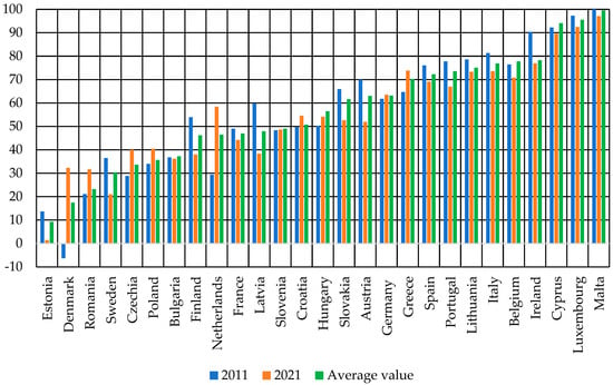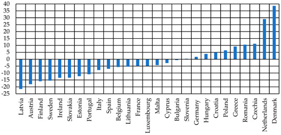 In Figure 1 we can see the groups of the countries in which energy import dependency is less than 50% and more than 50%. Countries such as Cyprus, Luxembourg and Malta belong to a group of countries with energy import dependency of more than 90%. The high values of the indicator for these countries are due to their geographical location and configuration [26]. It should be noted that during the studied period, no tendency towards a change in energy import dependency was observed in any country. In particular, in 2021, energy import dependence of the countries with a high level of dependence (more than 80%) was lower than in 2011 (Ireland, Cyprus, Luxembourg, Malta). In countries typically presenting with the lowest levels of this indicator (less than 30%), on the contrary, it increased in 2021 (Denmark, Romania, Czechia). If we analyze the dynamics of changes in energy import dependency (Figure 2), then in 2021 compared to 2011, the largest decreases (by more than 15%) were observed for Latvia—21.5%, Austria—18.0%, and Finland—15.9% (Figure 2), and the largest increases were observed for The Netherlands—29% and Denmark—38.6%. The gradual increase in energy import dependency of Denmark should be especially noted. Until 2013, Denmark was an exporter of natural gas, but in recent years it has become an importer—Denmark—Renewable Energy Products. https://www.trade.gov/country-commercial-guides/denmark-renewable-energy-products (accessed on 14 June 2023). It should be also noted that for Bulgaria and Slovenia the value of the indicator remains unchanged.