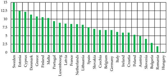 During the studied period, there was a tendency to increase the renewable energy sources in European countries (Figure 4). Sweden had the largest increase in renewable energy sources from 2011 to 2021–14.9% (Figure 4), and Hungary had the lowest–0.1%. All the European countries increased shares of renewable energy sources in accordance with Directive (EU) 2018/2001 of the European Parliament and of the Council on the promotion of the use of energy from renewable sources–https://eur-lex.europa.eu/legal-content/EN/TXT/?uri=celex%3A32018L2001 (accessed on 14 June 2023). Most countries increased this indicator by 5–12%. In particular, the countries with a low level of use of the renewable energy sources—Cyprus, Greece, Belgium, Ireland, Luxembourg, Malta, and The Netherlands—increased their use of renewable energy by 8%. However, such an increase in the use of renewable energy is not sufficient.