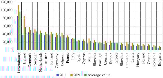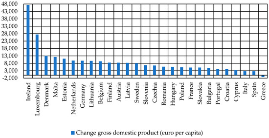 From 2011 to 2021 gross domestic product in Ireland increased by 47,440 euros per capita (Figure 6), and during the same period gross domestic product decreased only in one country–Greece, by 1240 euros per capita.