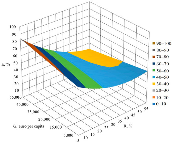 Equation (3) is adequate according to the Fisher’s test with a reliability level 0.95 (F = 30.585, Significance F = 0.0017) and has a determination coefficient R2 = 0.614. The characteristics necessary for estimating the coefficients of the equation are listed in Table 3. Moreover, the dependencies are adequate for changes in gross domestic product at market prices ranging from 5 to 55,000 euro per capita and changes in renewable energy sources ranging from 5 to 55%.