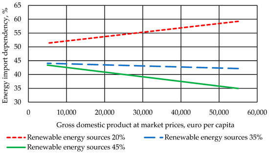 According to the first scenario (renewable energy sources 20%), with an increase in gross domestic product from 5000 to 5500 euros per capita, an increase in import dependency was observed by 1.15 times (from 51.3% to 59.2%) according to linear dependence (Figure 8). According to the second scenario (renewable energy sources 35%), there was a slight decrease in energy import dependency by 1.05 times (from 44.1% to 42.2%). According to the third scenario (renewable energy sources 45%), with an increase in gross domestic product, a sharper decrease in energy import dependency by 1.24 times (from 43.3% to 35.0%) was observed. The analysis of Equation (3) for extremes allowed us to conclude that when using energy from renewable sources at a level of 32%, the economic development of the country does not require an increase in energy import dependency, and at higher values of energy use from renewable sources, energy import dependency may generally decrease.