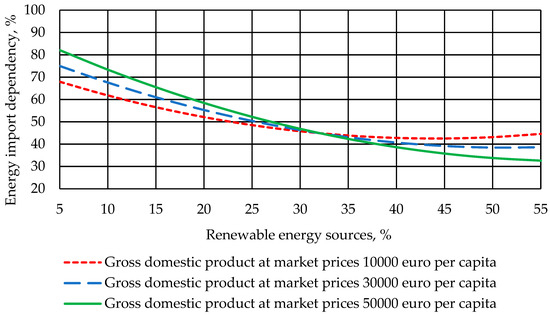 We also analyzed scenarios concerning the impact of increasing renewable energy sources on energy import dependency at different values of the domestic product level. In Figure 9, the impact of increasing renewable energy on energy import dependency for three values of gross domestic product—10,000, 30,000 and 50,000 euros per capita, is shown.