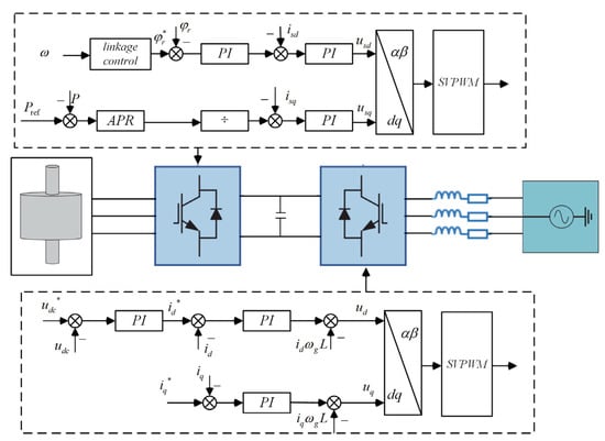 The control of DC bus voltage adopts closed-loop control, and the output is used as the compensation of q-axis current to make the control more stable and effective. The overall control structure of the FESS is shown in Figure 2.