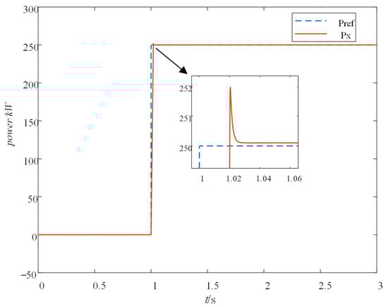 It can be seen from Figure 3 that the FESS starts to change with the given step signal at 1 s. The dashed line refers to the given power of 250 kW (Pref), while the solid line represents the response of the established flywheel model (Px). The FESS can start to respond after 0.02 s, and can then stably track the given step power. This shows that the response capability of the FESS is in milliseconds and the adjustment is rapid. According to the response time, it can be seen that the FESS can effectively meet the frequency regulation of power system.