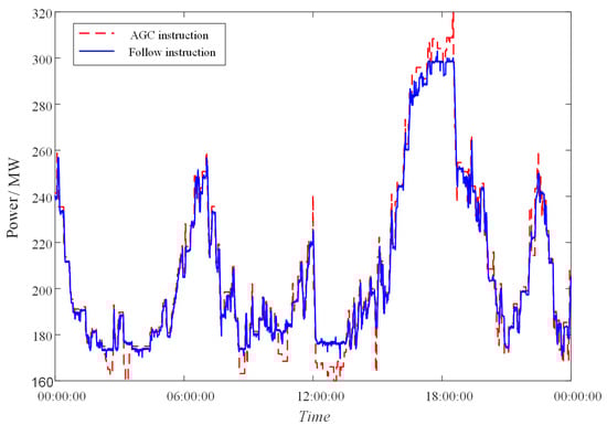 The AGC dispatching instructions received by a unit on 1 October 2021 is taken as an example, shown in Figure 4. The AGC instructions received within 24 h changed a total of 290 times, with an average change of AGC instructions every 5 min. Among them, 56% of the AGC signals last within 3 min, 77% of the AGC signals last within 6 min, and 98% of the AGC signals last within 15 min. It can be seen that the AGC instructions received by the unit fluctuate frequently, but most of the frequency modulation time is within 15 min.