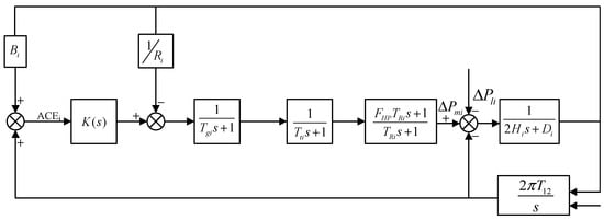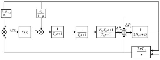 In the frequency control and regulation of the power system, the small signal analysis model can be established by using the linearization method at the stable operational point. According to the literature [], based on the single-area power grid dominated by traditional thermal power units, the secondary frequency modulation model of the single-area power grid is established. The model mainly includes the secondary frequency modulation controller, governor, reheat steam turbine, tie line, and load.