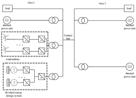 When the wind power grid leads to fluctuation of the system frequency, due to the slow response speed of the thermal power unit, it cannot follow the AGC instructions issued immediately, and the adjustment accuracy of the control is also limited. If it only relies on the use of thermal power units to participate in the frequency modulation by responding to the dispatching instructions, it is difficult to return to the expected reference frequency in time. Therefore, according to the characteristics of FESS, taking into account the two-area interconnected power grid model of wind power, a frequency control method of an interconnected power system regulated by an FESS is designed. The thermal power unit and the FESS undertake the frequency modulation task of areaal control deviation, respectively. FESS is used to assist in the auxiliary frequency regulation of power systems containing wind power. It is assumed that the overall topology of the flying system of the two-area interconnected power grid is as shown in Figure 7. Area 1 withdraws some thermal power units and increases a certain proportion of wind turbines accordingly. In order to alleviate frequency fluctuations, the FESS is used for auxiliary frequency regulation. Area 2 power generation is all provided by thermal power units, and the two areas exchange power through the tie line.