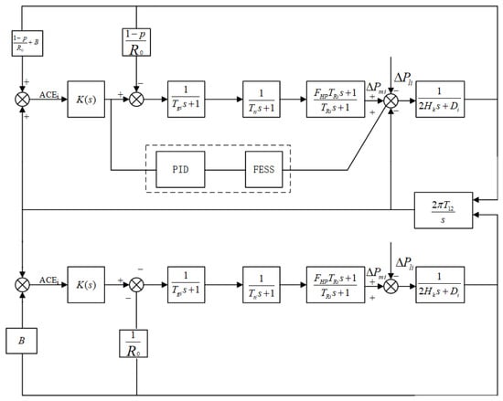 Therefore, according to the above assumptions and Figure 6, the simplified analysis model of the load frequency control transfer function of the two areas with wind power integration assisted by an FESS is shown in Figure 8.