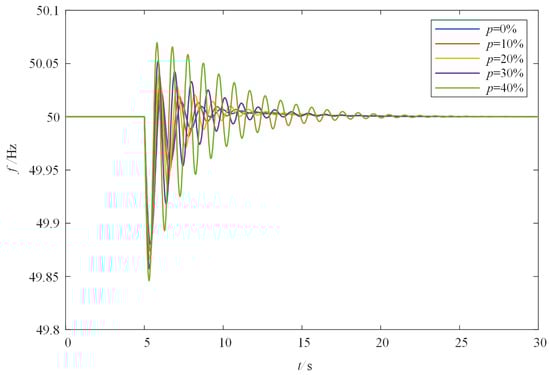 Case 1: When the wind turbine is connected to Area 1, the wind power penetration rate p of Area 1 gradually increases. At this time, the frequency modulation ability of the wind turbine is not considered, and the step load disturbance of 0.1 p.u. is added to Area 1 at 5 s. At this time, the frequency response of Area 1 is shown in Figure 9 below, and the frequency characteristic index of Area 1 under different wind power penetration rates is shown in Table 1.