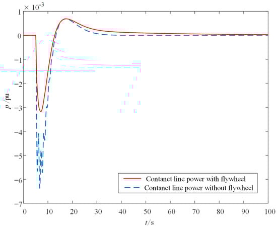 Case 2: When the wind turbine is connected to Area 1, when the wind power permeability p = 30%, the FESS with 10% rated power of wind power installed is used to assist in frequency modulation. A step load disturbance of 0.1 p.u. is added to Area 1 at 5 s. The frequency response of Area 1 and Area 2 and the deviation of tie line are as follows: Figure 10, Figure 11 and Figure 12: